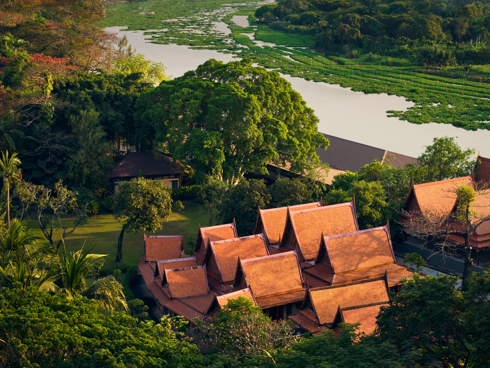 A sprawling 50-acre riverside sanctuary where Thai heritage architecture meets purposeful wellness design amid tropical gardens and tranquil waterways.